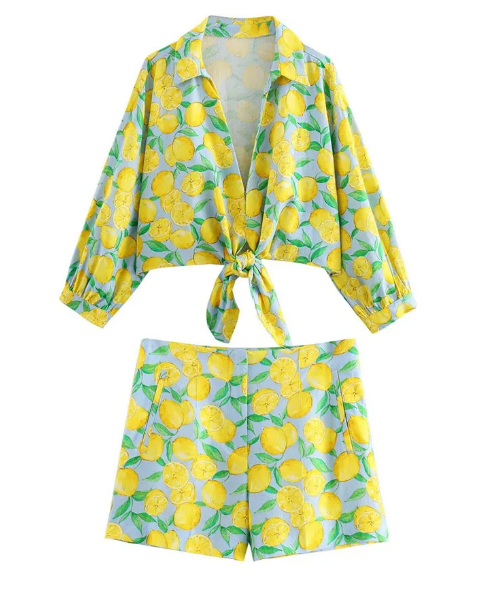 Anneliese - Kurzes 2-teiliges Set für Frauen mit gelbem Fruchtdruck