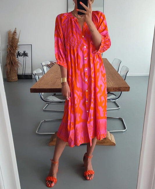PureWear - Rosa und orangefarbenes Midikleid mit geraffter Knopfleiste